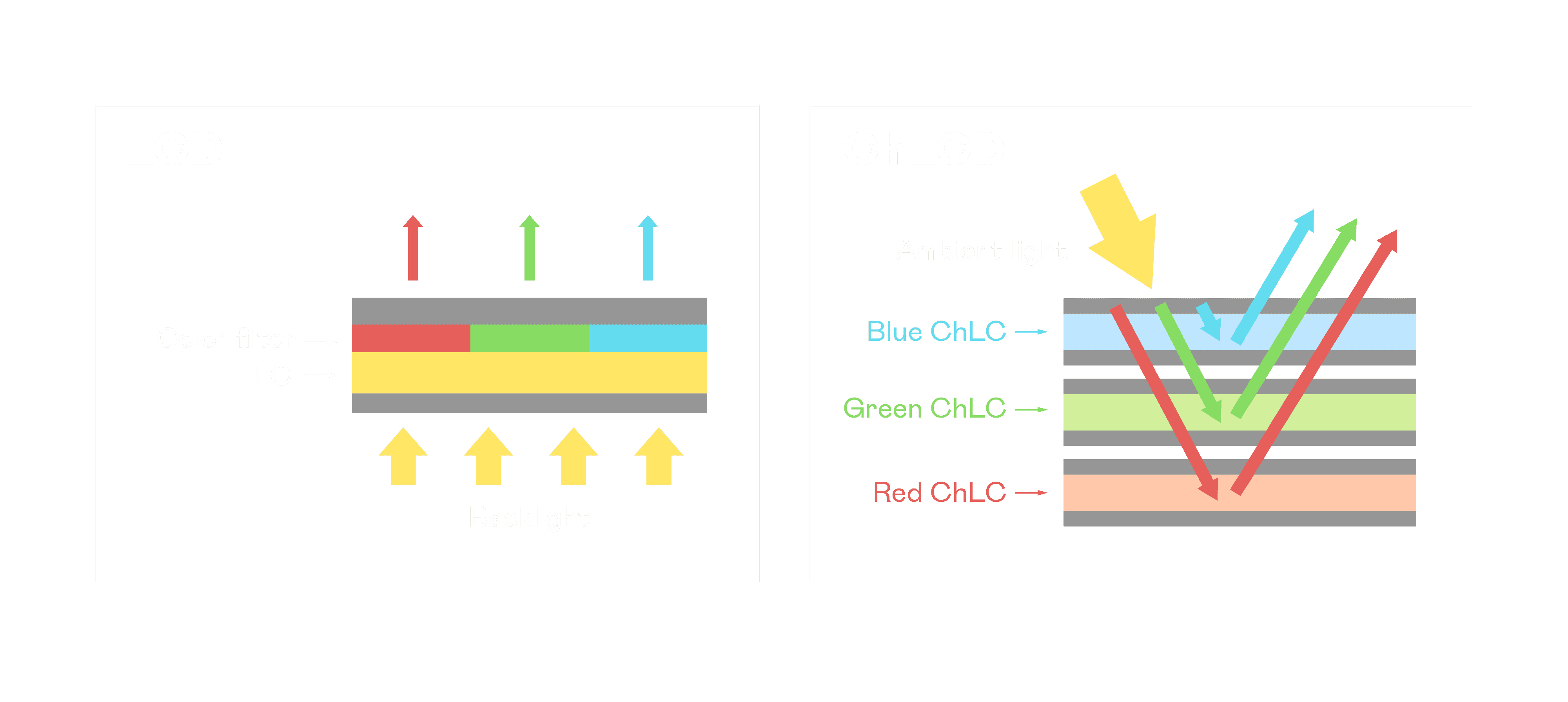 ChLCD 胆固醇液晶就如同纸张一样,,,,透过反射环境光来显示影像,,,因此长时间观看不易造成人眼视觉疲劳,,,,可达到护眼效果。。。。当处于户外阳光下使用,,,,LCD 影像容易失真而不易观看,,但胆固醇液晶仍可维持较佳的影像品质。。。
